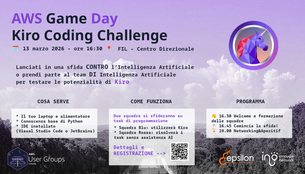 Il prossimo 13 marzo Napoli ospiterà l’AWS Game Day – Kiro Coding Challenge, iniziativa promossa da AWS User Group Caserta e coordinata da Epsilon, azienda parte della rete Innovare Network.
